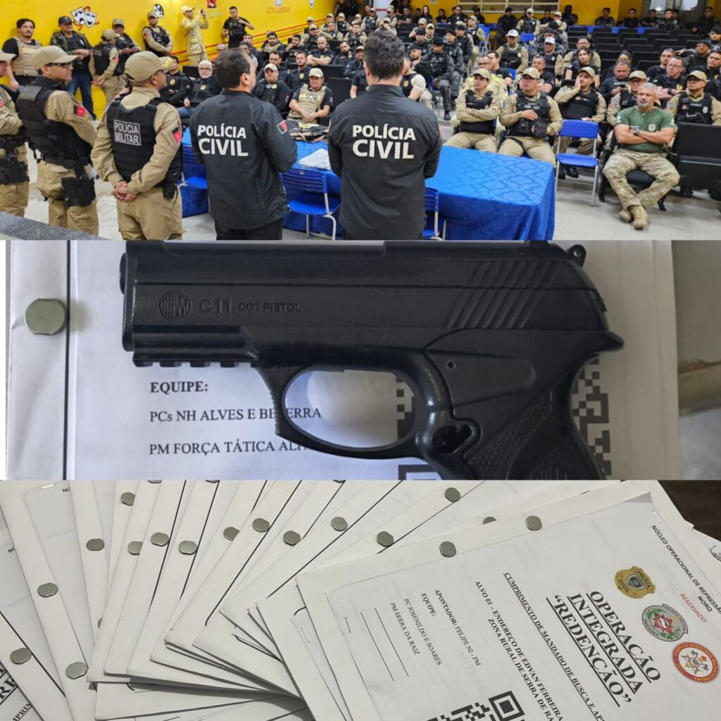 A Polícia Civil da Paraíba, por meio da 8ª Delegacia Seccional de Polícia Civil (DSPC), deflagrou, nas primeiras horas desta quinta-feira (16), a Operação Redenção, ação integrada que contou com a participação da Polícia Militar, Corpo de Bombeiros e Secretaria de Administração Penitenciária. A operação, que contou com a participação de cerca de 100 policiais, teve como objetivo o cumprimento de oito mandados de prisão e 16 mandados de busca e apreensão nos municípios de Guarabira, Sertãozinho, Duas Estradas e João Pessoa. Durante o cumprimento do mandado, duas armas de fogo foram apreendidas.