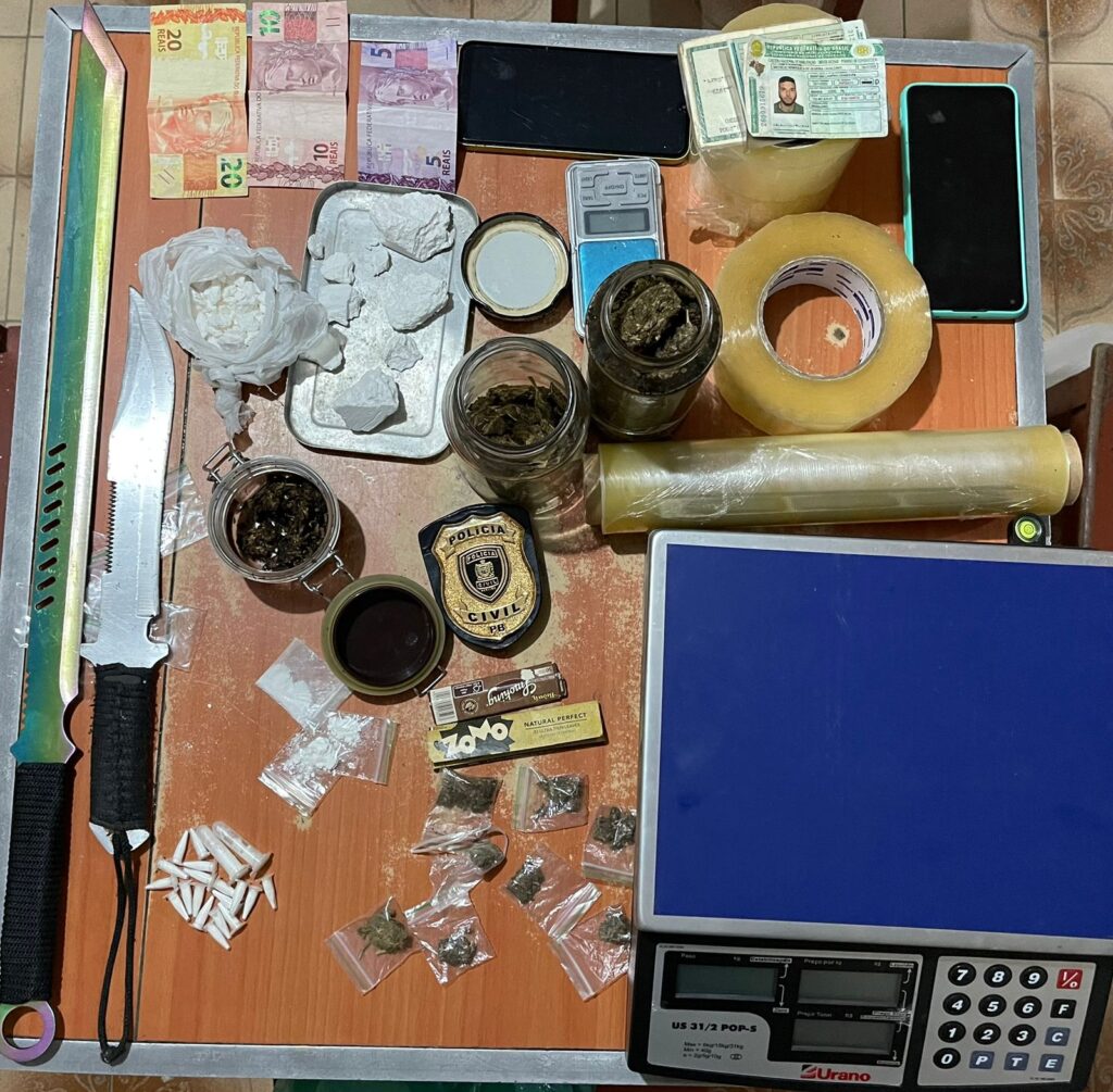 A ação teve início após denúncia anônima informando que um dos investigados estaria utilizando a própria residência para comercializar entorpecentes. De posse das informações, os policiais civis se dirigiram ao endereço e abordaram o suspeito em frente ao imóvel, acompanhado de outro indivíduo, que também foi preso em flagrante.