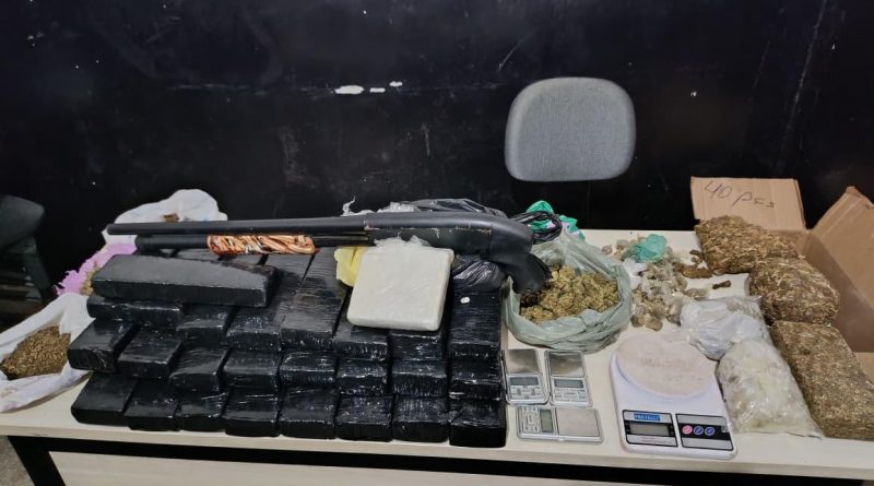 A apreensão foi resultado de denúncias recebidas pela PM. O imóvel que estava sendo usado como depósito não tinha característica de moradia, apenas de que era específico para armazenar os entorpecentes. Além da arma, que era de calibre 12, foram apreendidas drogas dos tipos maconha (12, 35 kg), skank (1,3 kg) e cocaína (1,3 kg).