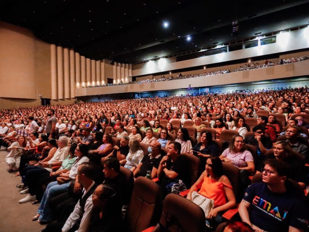 O vice-prefeito Leo Bezerra celebrou o encontro desta quinta-feira com os profissionais da educação municipal, que lotaram o Teatro A Pedra do Reino, onde destacou os avanços da Prefeitura na área.