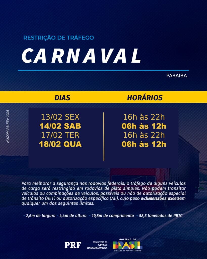 JOÃO PESSOA/PB – Com o objetivo de aumentar a segurança viária e garantir a fluidez do trânsito durante o período do Carnaval 2026, a Polícia Rodoviária Federal (PRF) comunica as novas restrições para o tráfego de veículos de carga com dimensões ou pesos excedentes em rodovias federais. A medida foca nos trechos de pista simples , onde o risco de colisões em ultrapassagens é mais elevado.