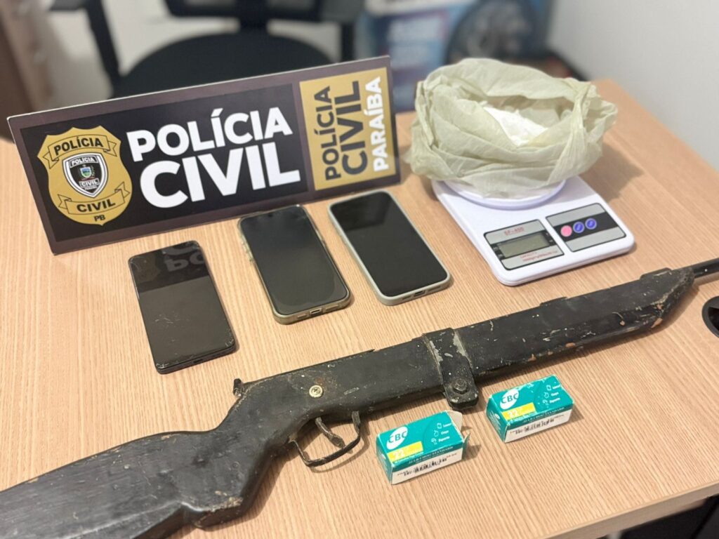 No curso das diligências, foram apreendidos substância análoga à cocaína, uma arma de fogo, munições, aparelhos celulares e dois veículos de luxo. Todo o material foi encaminhado à Delegacia de Polícia Civil para os procedimentos cabíveis. O prejuízo estimado à organização criminosa é de aproximadamente R$ 300 mil.