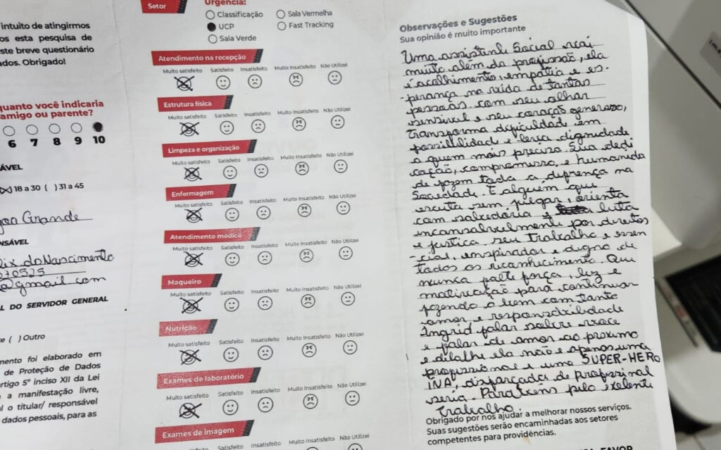 Pesquisas – O índice de satisfação do usuário é medido a partir das pesquisas de satisfação realizadas em todos os setores da unidade hospitalar. “O objetivo das pesquisas é identificar as fragilidades do serviço e solucioná-las. A pesquisa no leito é para identificar aquele momento da estadia do paciente conosco. Mas fazemos também a pesquisa por telefone após a alta”, explica Vivian de Paula. Telma Silva respondeu a pesquisa e fez questão de citar nominalmente os profissionais do hospital.