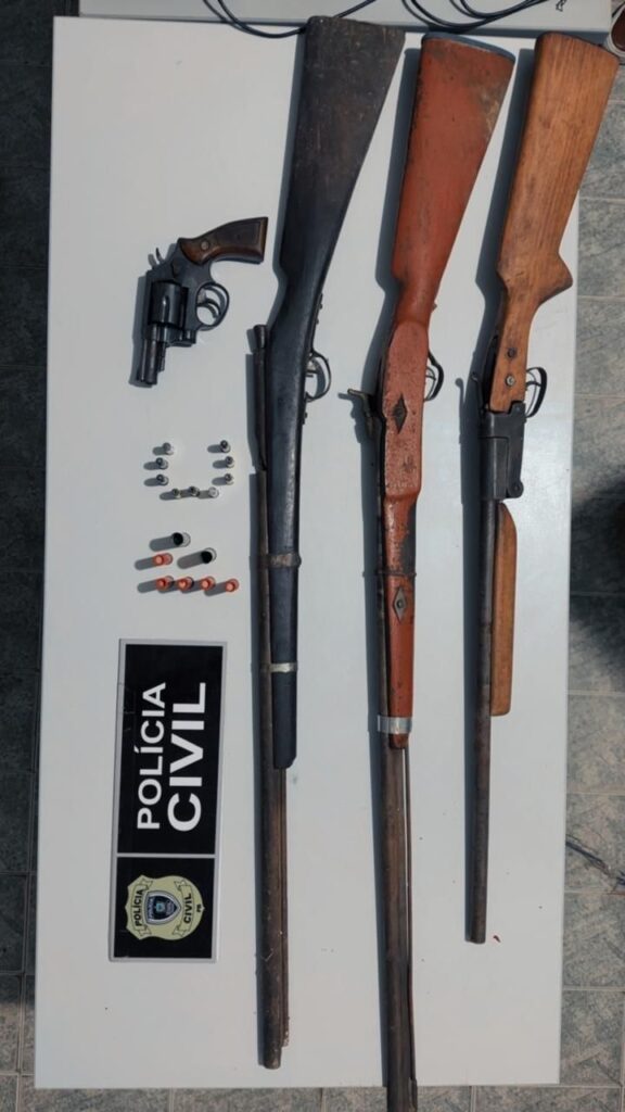 No decorrer das diligências, após a confirmação da denúncia, o investigado foi localizado em sua residência, onde foram encontradas três espingardas e um revólver calibre .38. O material apreendido foi encaminhado para os procedimentos legais cabíveis. Diante da situação de flagrante, o suspeito foi conduzido à unidade policial, onde foram adotadas as medidas cabíveis, permanecendo à disposição da Justiça.