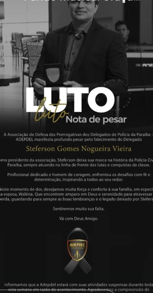 A Associação de Defesa das Prerrogativas dos Delegados de Polícia da Paraíba (ADEPDEL) manifestou profundo pesar pelo falecimento do delegado Steferson Gomes Nogueira Vieira, presidente da entidade e uma das principais lideranças da Polícia Civil no estado.