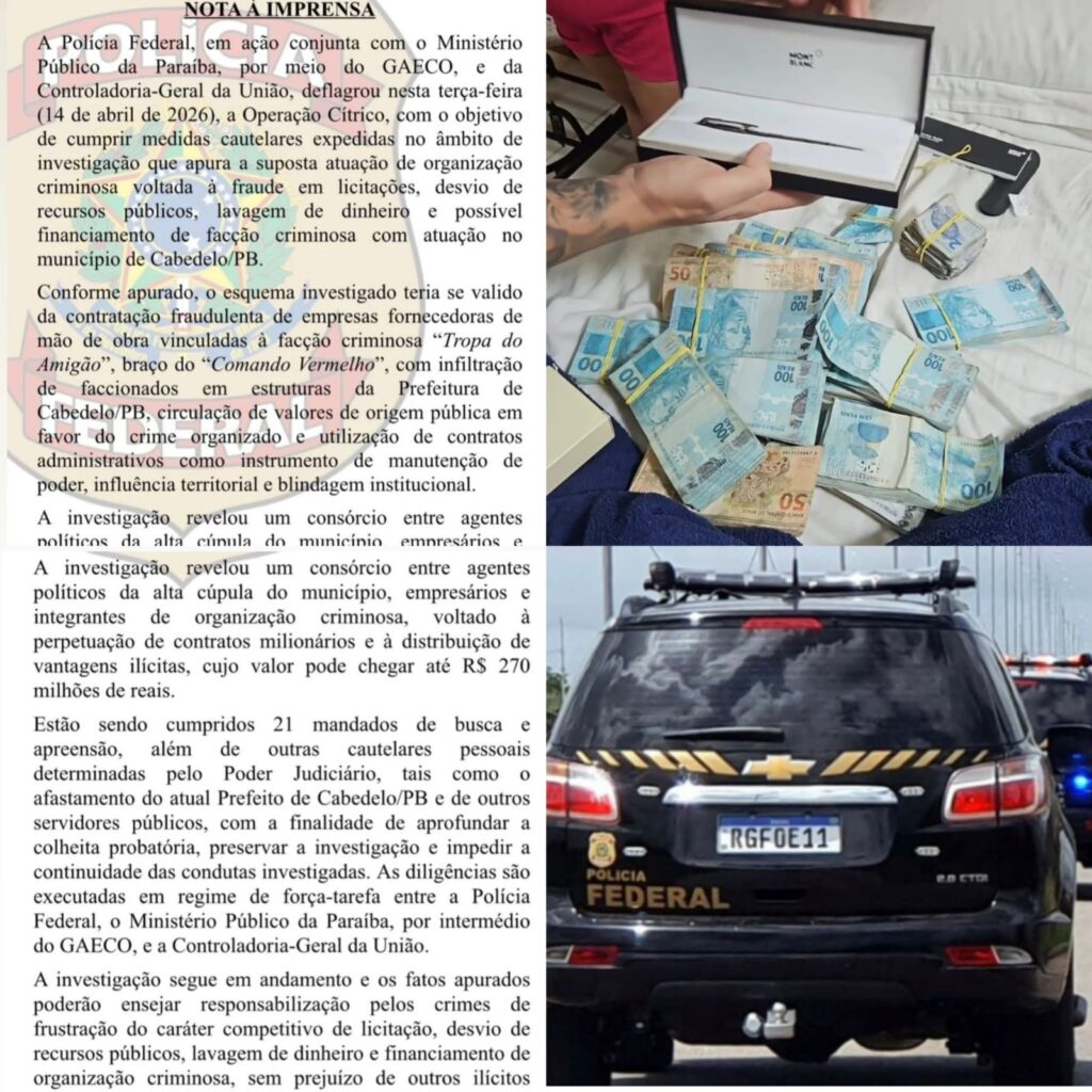 Treze pessoas entre agentes públicos, advogados e empresários foram alvos da Operação Cítrico, desencadeada nesta terça-feira (14) pela Polícia Federal, em ação conjunta com o Ministério Público da Paraíba, por meio do Grupo de Atuação Especial Contra o Crime Organizado (Gaeco), e da Controladoria-Geral da União (CGU). A ação afastou do cargo o prefeito eleito de Cabedelo, Edvaldo Neto (Avante) e cumpriu medidas cautelares expedidas no âmbito de investigação que apura a suposta atuação de organização criminosa voltada à fraude em licitações, desvio de recursos públicos, lavagem de dinheiro e possível financiamento de facção criminosa com atuação no município de Cabedelo.