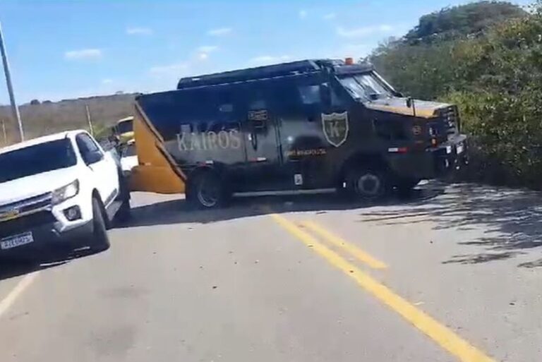 Criminosos armados tentaram atacar um carro-forte da empresa Kairós, mas os vigilantes que estavam no veículo conseguiram impedir a ação e os